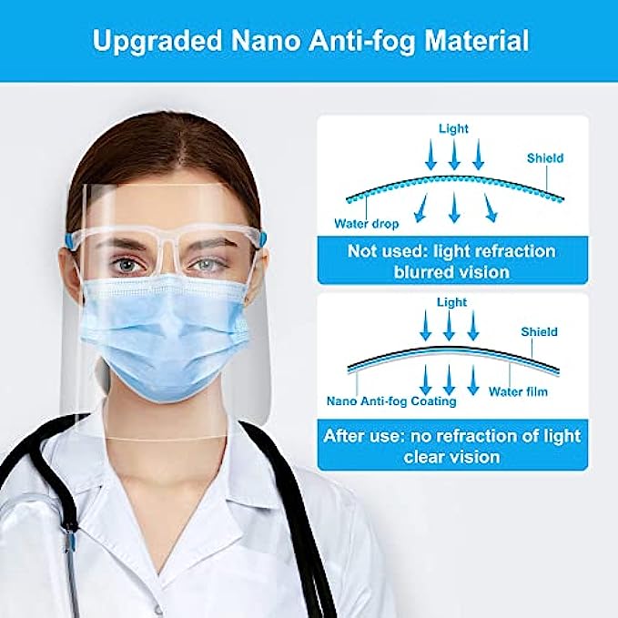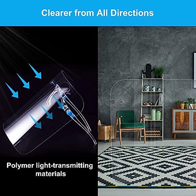 【Ultra Clear and Anti-fog Visor】This Face shields with Glasses frames could provide super clear visibility and will not collect water vapor and be cloudy when breathing. Special Anti-fog coating is put on both side of the shield for use in different ascensions. The shield is super clear, after peeling off LAYERS OF PROTECTIVE FILMS ON BOTH SIDE OF THE SHIELD. Environmentally Reusable after disinfecting. Some assembly required.